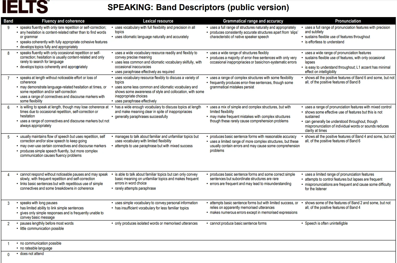 These descriptors serve as your roadmap to success — they show what examiners listen for and what skills you need to improve to reach your target band.